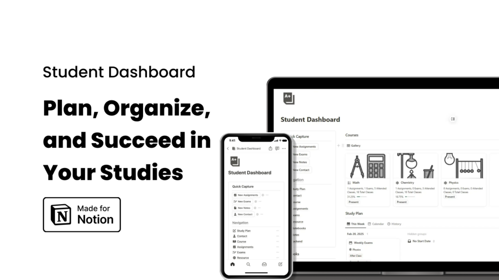 The Notion Student Dashboard is a powerful all-in-one study planner designed to help students manage their courses, assignments, exams, study plans, and notes in one structured and easy-to-use interface. Whether you're in high school, college, or university, this template will keep you on track, reduce stress, and improve productivity.